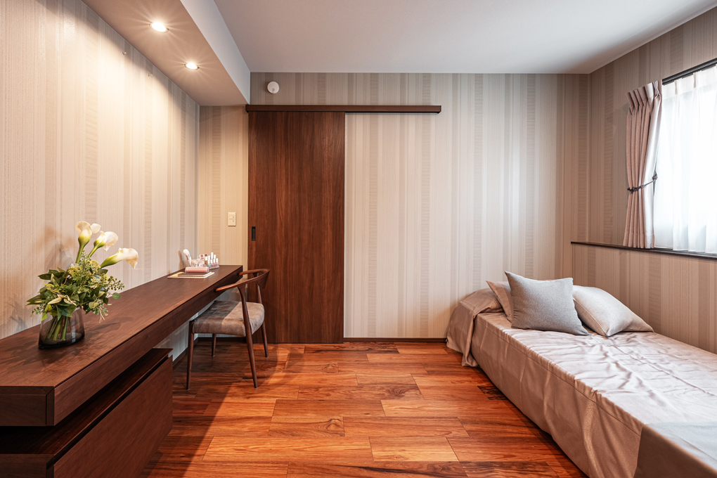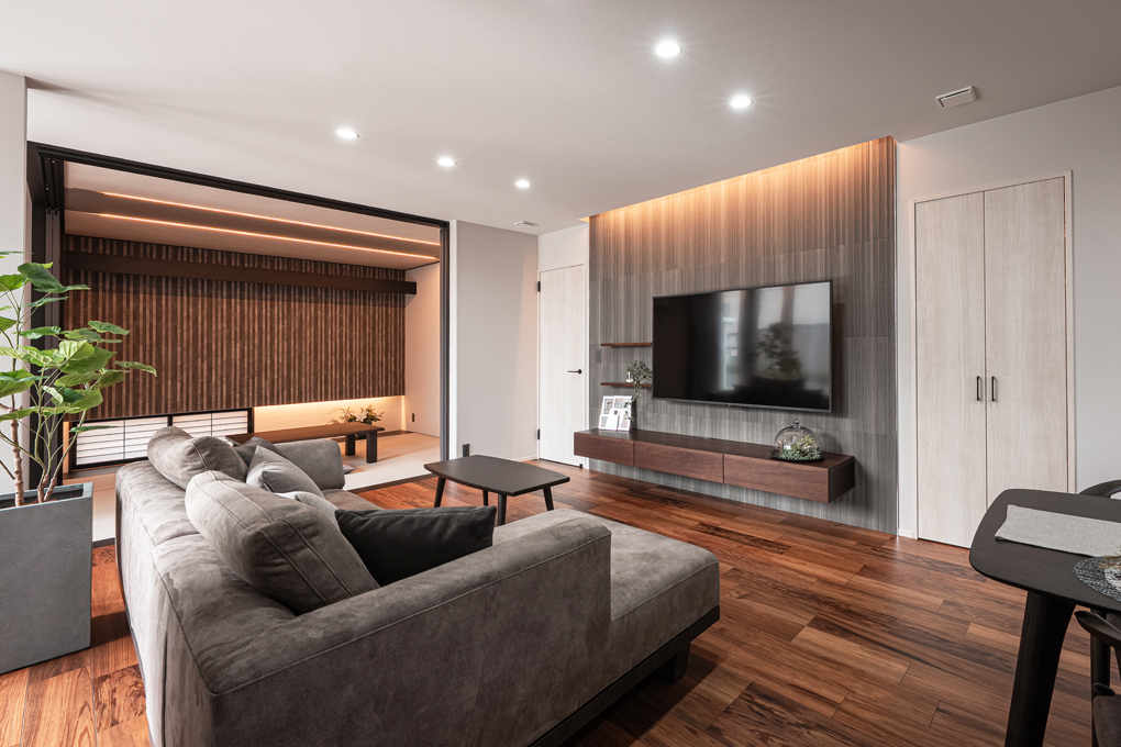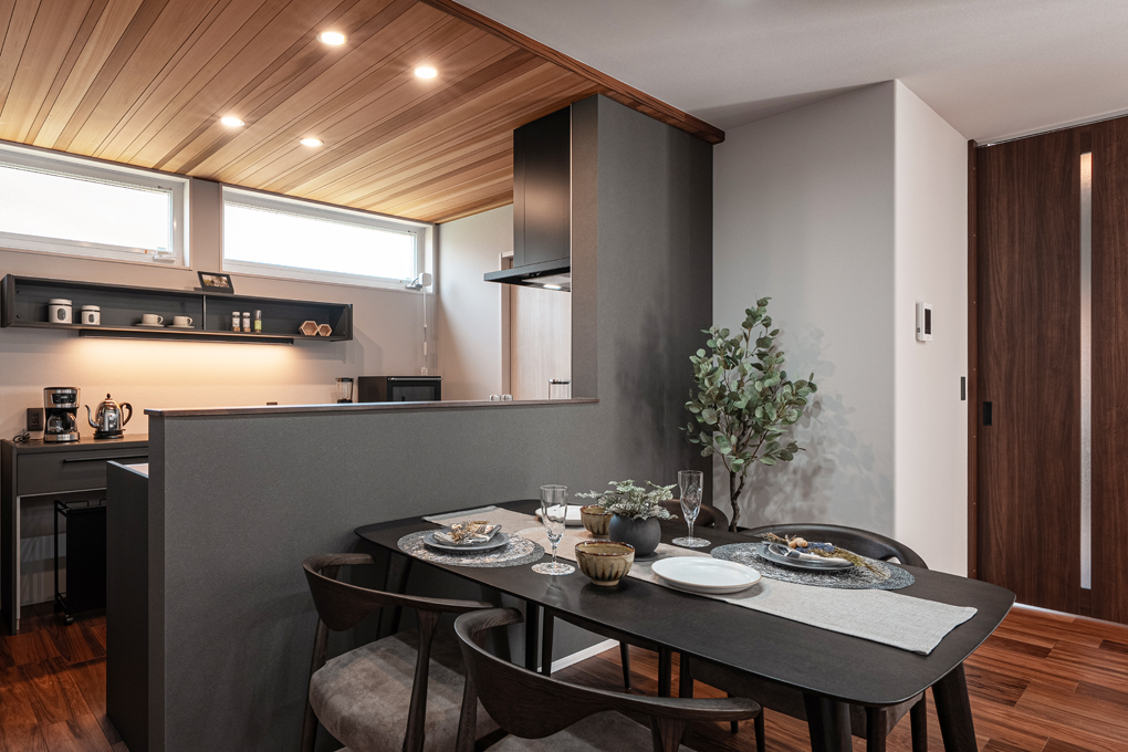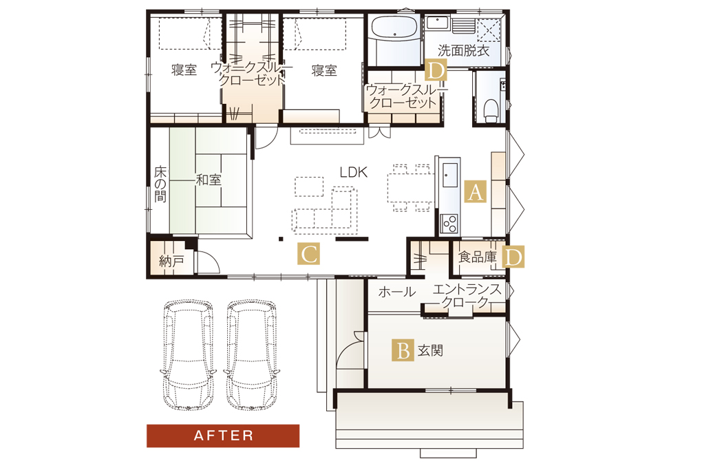 玄関から直接買い物したものを収納できる食品庫や水廻り近くのウォークスルークローゼット等、動線上に上手く収納を組み込むことで家事がスムーズに。一直線上の動線で各場所の把握もしやすく家事も共有しやすくなります。