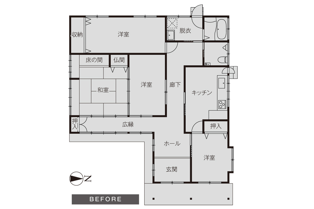 閉鎖的だった間取りから一新。大間口の窓から日差しの入る明るく開放感あふれるLDKへと生まれ変わりました。キッチンから全体を見渡せる設計で夫婦の会話も自然と弾むように。仕切りを取り払った大空間でゆったりとしたひと時を。